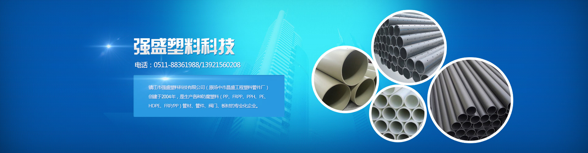 鎮(zhèn)江市強(qiáng)盛塑料科技有限公司(原揚(yáng)中市昌盛工程塑料管件廠)創(chuàng)建于2004年,是生產(chǎn)各種防腐塑料(PP、FRPP、PPH、PE、HDPE、FRP/PP)管材、管件、閥門、板材的專業(yè)化企業(yè)。公司擁有各類先進(jìn)生產(chǎn)設(shè)備,固定資產(chǎn)約3800萬(wàn)元,可生產(chǎn)管材、管件口徑為Φ15-Φ1200mm,產(chǎn)品規(guī)格齊全。目前產(chǎn)品廣泛適用于醫(yī)藥、食品、冶金、造紙、電力、礦山、城市污水處理、垃圾填埋、輕工紡織等領(lǐng)域,暢銷全國(guó)各省市自治區(qū),遠(yuǎn)銷二十多個(gè)國(guó)家及地區(qū)。